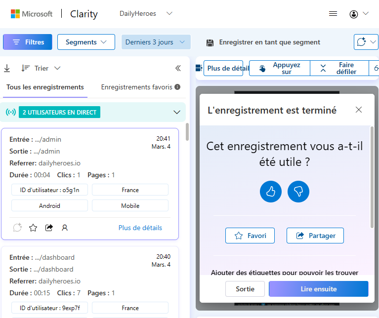 Pour les sessions d’enregistrements, on retrouve des statistiques, ainsi que la possibilité de trier les enregistrements et retrouver les informations de l’utilisateur (Pays, Système d’exploitation, résolution, etc).