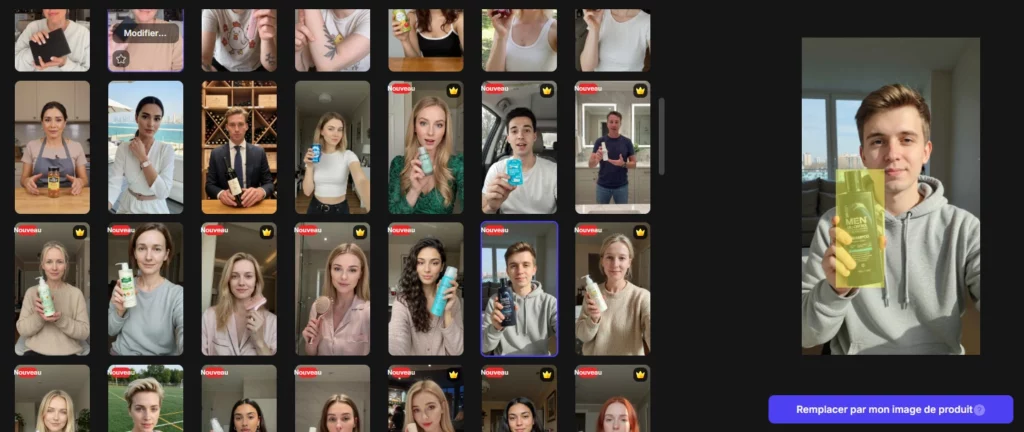 Dans un premier temps, il faut sélectionner l’Avatar que l’on souhaite utiliser dans notre vidéo, il y a plusieurs modèles, en fonction des produits qu’ils portent. Que ce soit des produits de beautés, des chaussures, des bouteilles, etc. Tu peux d’ailleurs filtrer en fonction de ton type de produit pour trouver ton avatar idéal.
